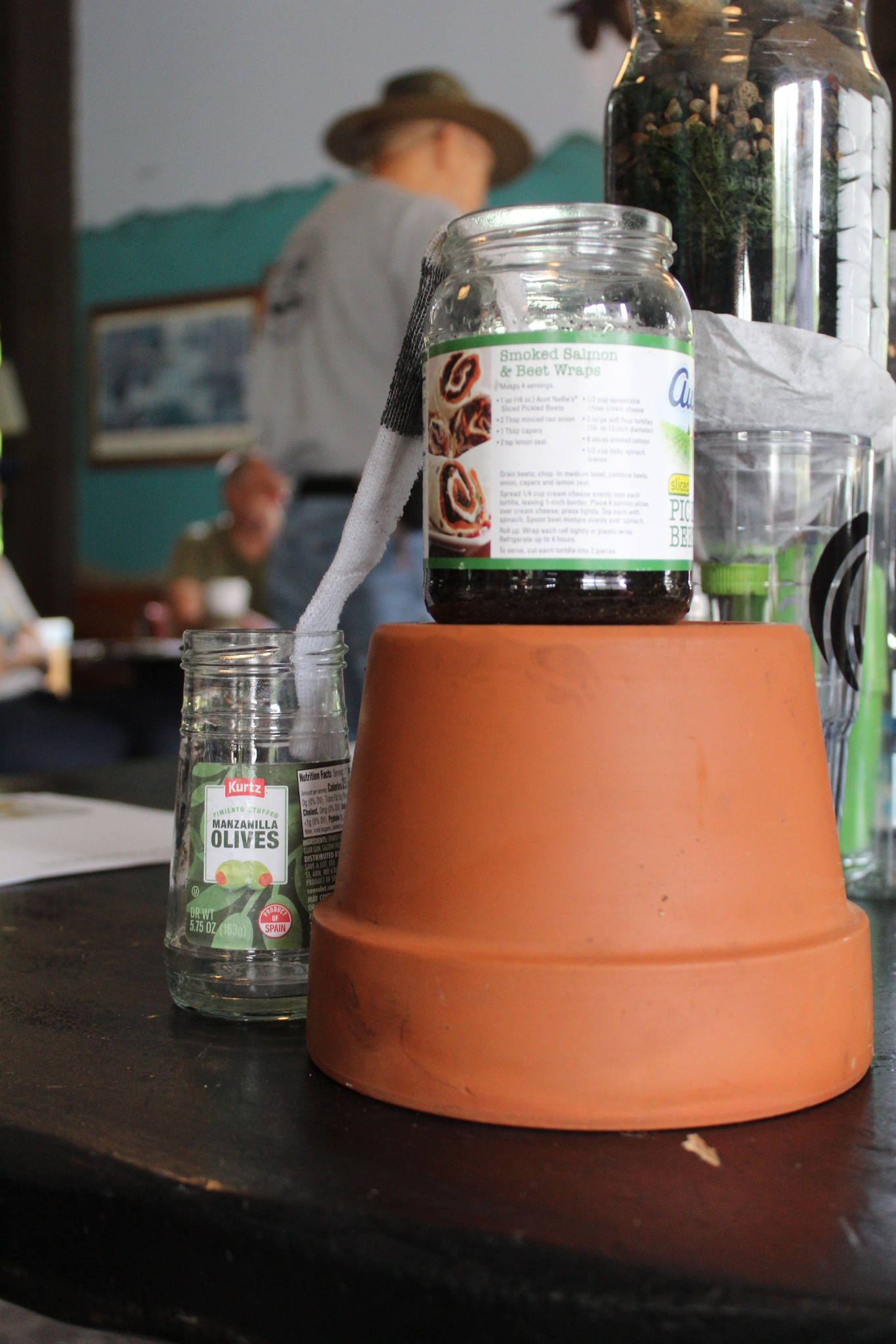 This photo from Saturday’s Water Procurement class takes a bit of explanation. The glass jar on top of the flower pot was filled with muddy, yucky water. Then a cotton sock was used to wick the liquid down into the other jar where the water came out much clearer. The cotton fiber acted as an efficient filter for turbidity (junk in the water). The flower pot was used to explain how terra cotta can also be used in a pinch to filter water. Water will leach through certain porous materials like clay pots in the same manner that ground water leaches around and through shale and limestone. Fun stuff!